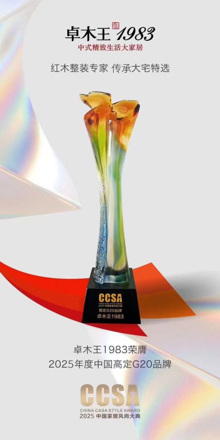2025年7月8日,在万众瞩目的“万福仓之夜——致敬高定十年·第十届CCSA家居风尚大典暨2025高定十年G20+颁奖礼”上,红木整装创lin品牌卓木王再度荣膺“高定G20品牌大奖”。