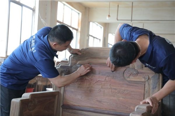 在工艺上,鸣智红木摒弃工业化流水线的浮躁,以纯手工打磨为核心特色。匠人运用砂纸与刮刀反复抛光,拒绝化学上漆与打蜡,最大程度保留木材的原始质感。这种“素面朝天”的工艺,既避免了甲醛污染,又让家具随着时间推移自然包浆,形成温润如玉的独特光泽,彰显“以木为本”的健康环保理念。