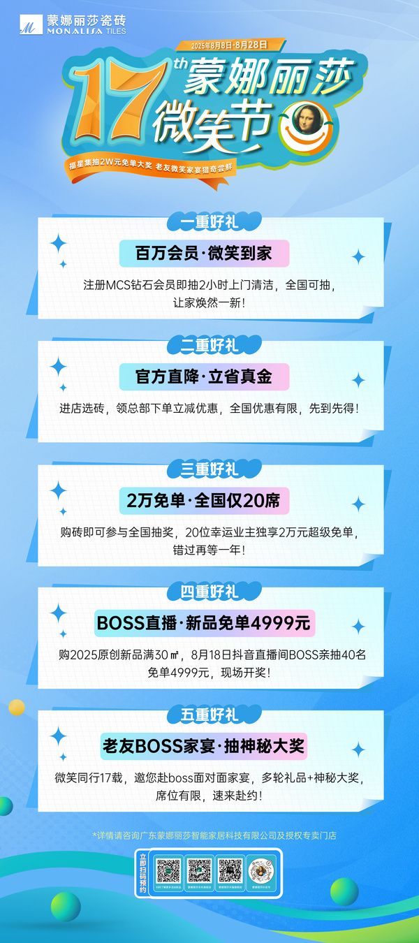 自创立以来,蒙娜丽莎瓷砖始终以匠心品质与创新设计为核心,致力于为万千家庭打造安全、美观、耐用的家居空间。第17届微笑节,无疑是蒙娜丽莎瓷砖回馈消费者信赖的诚意之作! 无论是最高两万元的超级免单减轻装修重负,还是立减200元的普惠福利、4999元的新品免单惊喜,乃至注册抽保洁、老友专属家宴等贴心服务,无不体现着品牌对用户全周期体验的重视。选择在年中装修黄金季推出,正是为了让消费者能以更轻松的姿态,开启理想新家的筑造之旅。