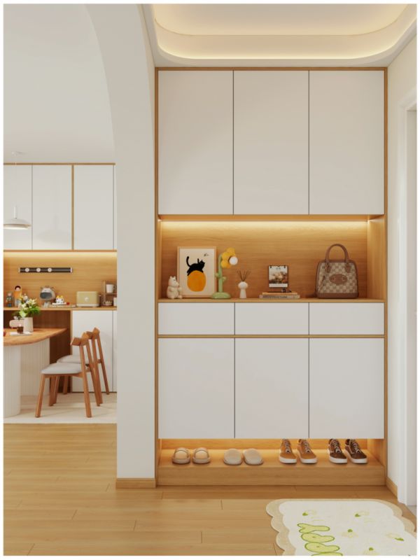 玄关柜采用内嵌式设计,中部留空方便随手置物,视觉极简;底部悬空便于放鞋,搭配暖调灯光,营造温馨归家仪式感。