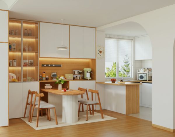 整墙餐边柜结合嵌入式餐桌,用餐储物一体,保障过道畅通。开放式厨房定制延伸台面,轻松满足备餐、小酌、轻办公等多元需求,空间利用高效。