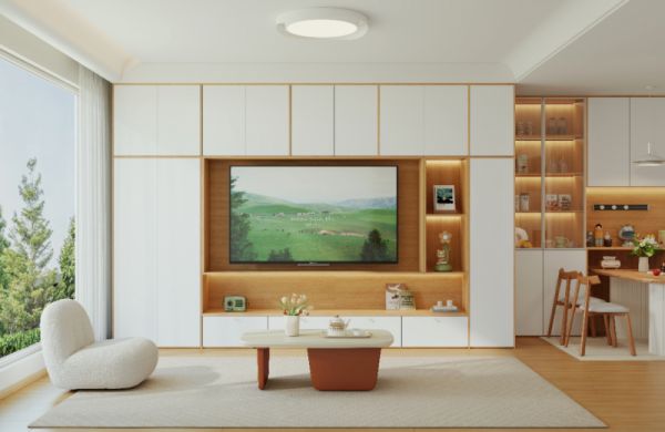 回字形电视柜遵循“藏八露二”布局,实用与美观并存;无拉手设计保持视觉简约清爽。