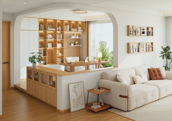 沙发背景墙打通为弧形拱门,矮墙隔断结合抬高地台,清晰区隔功能。半开放式布局与客厅自然衔接,层次分明不压抑,宅家办公氛围松弛舒适。