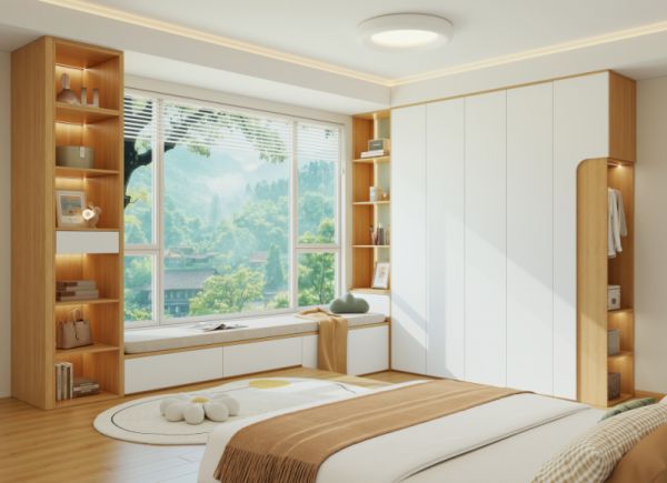 衣柜、飘窗卡座与储物柜一体定制,整体性强且美观;衣柜侧面开放格打造实用次净衣区。地台床巧妙划分空间,兼顾安全感与温馨氛围。