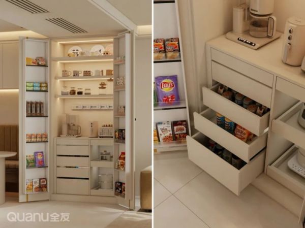 柜内采用分段式设计:上层陈列杯具等易碎器具,中部操作台高度设置在50-60cm即可,预留滑轨插座,方便放置和取用咖啡机、面包机等小家电,下层则用抽屉收纳咖啡、茶包、餐具等,柜门一关,杂乱瞬间隐形。