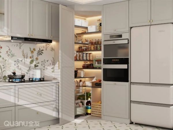 厨房转角定制钻石型高柜,采用可调节层板错层收纳,高度随心调,灵活性更高。下层存放米面粮油和小推车,中部黄金位预留插座,收纳各类小型家电,顶部搭配储物盒,存放使用频率较低的杂物。