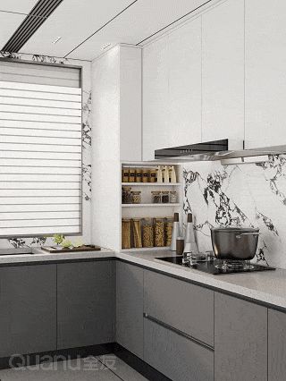 围绕厨房烟道定制进深约20cm的薄柜,调料、香料统统上墙,既能美化厨房空间,还能将瓶瓶罐罐集中收纳,避免台面杂乱,防止油污沾染。