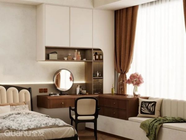 在飘窗上增设抽屉,轻松收纳饰品、卷发棒等小物,再沿卧室转角定制梳妆台,结合通顶式收纳柜,既能分类存放美妆用品,又能收纳书籍文件。整合储物、休闲、美妆、办公四大功能,激活鸡肋转角区,实现小空间的多功能利用。