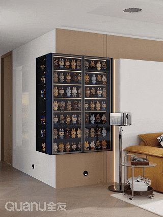 沿墙面拐角定制可视化悬浮展示柜,潮玩盲盒上墙陈列,搭配隐藏灯带,灯光效果媲美专业展柜。在不占用额外空间的前提下,实现手办、藏品的收纳与展示,大幅度提升了家居美观性和生活仪式感。