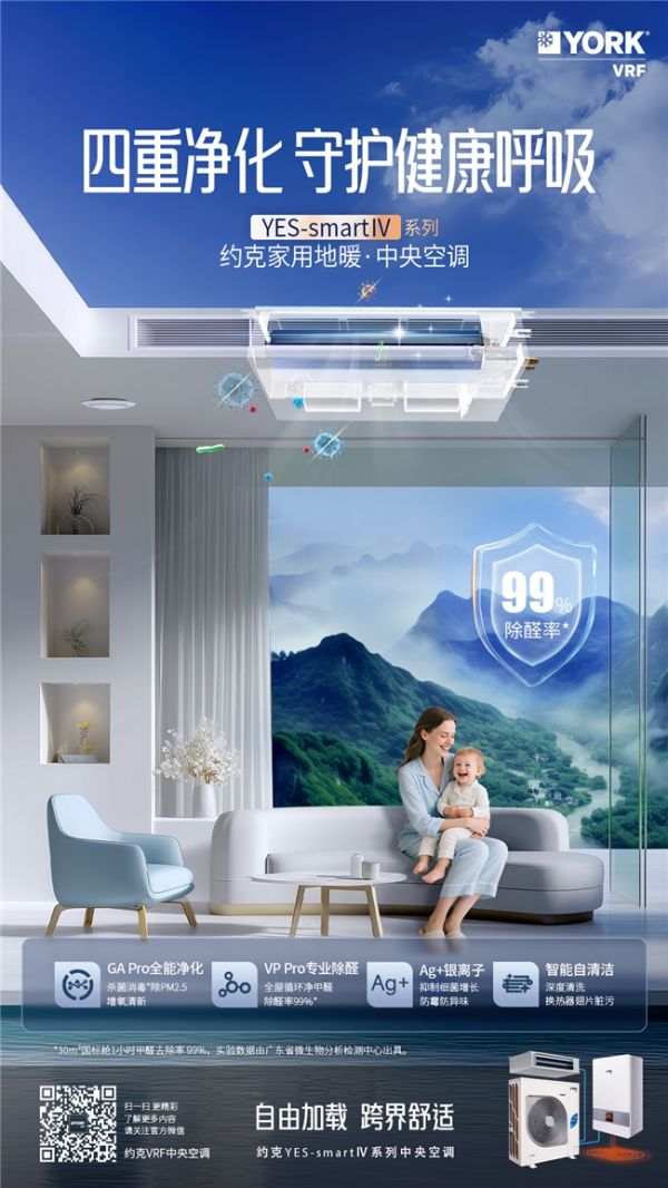 当清晨的阳光掠过窗台,你是否渴望深吸一口清新的空气?当梅雨季的潮湿爬上墙壁,你是否厌烦了衣物永远晾不干的黏腻?当深夜的空调冷风直吹床头,你是否总在半梦半醒间裹紧被子?约克VRF中央空调YES-smart IV系列新品上市,水氟合一、自由组合,将舒适家的设计权交付于你,不止是调节温度的机器,更像一位懂生活的伙伴。