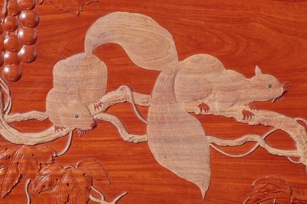 匠人以刀为笔,在坚硬的紫檀木上施展绝技,通过深浅、疏密、角度的极致变化,模拟工笔翎毛的精细效果,松鼠毛发丝丝毕现,眼神炯炯如生,赋予冰冷木材以灵动的生命温度。非遗绝技与传统纹饰的相遇,是技法与意蕴的双重升华,让文化的温度直抵人心。
