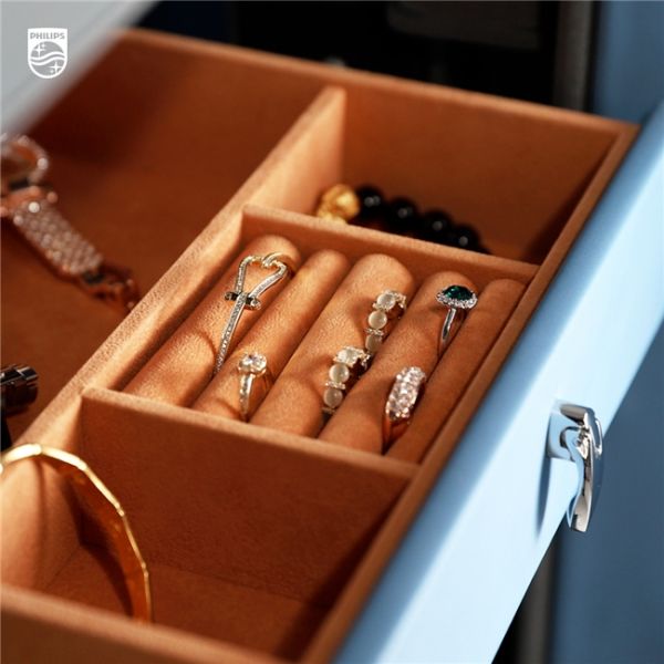 此外,柜内的贴心设计同样值得称道,导轨式抽屉让珠宝首饰分区收纳,皮革内衬温柔呵护贵重物品;底部隐藏暗格可存放护照、合同等私密文件,内置夜视灯在开启柜门时自动点亮,让深夜取物无需摸黑。从物理防御到智能验证,从便捷存取到隐私保护,飞利浦SBX602以无微不至的周全考量,确保我们再离家期间,家中的珍贵之物始终能够处于最安心的守护之中。