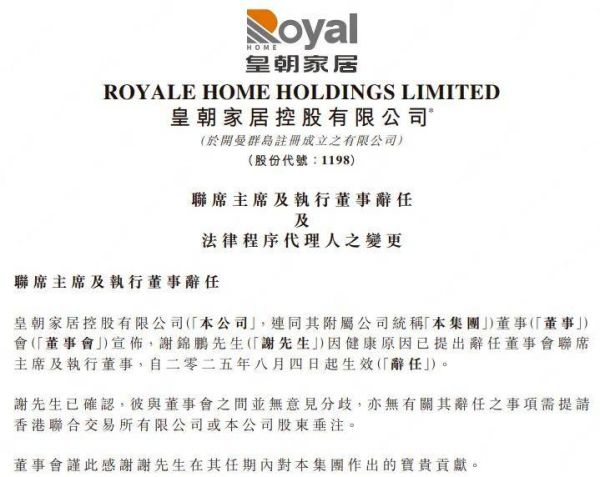 近日,皇朝家居发布公告,谢锦鹏先生因健康原因已提出辞任董事会联席主席及执行董事,自2025年8月4日起生效。
