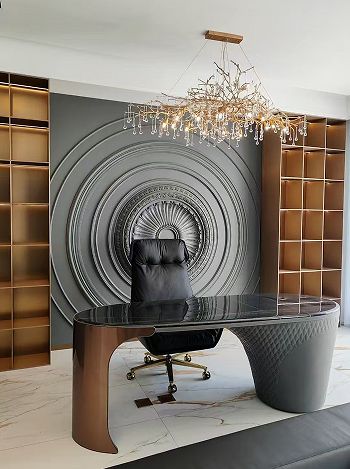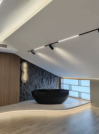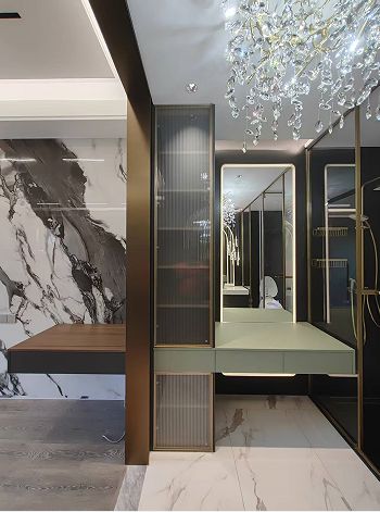 真正的个性化设计,不在于刻意的标新立异,而在于对个体特质的精准回应。我们不制造夸张的场景,而是将业主的生活偏好转化为空间语言的精确表达。例如去年我们完成的一个美妆博主位于中海岳麓山的上叠别墅,客户喜爱的意式暗黑轻奢风格,在材料选择与工艺处理上,我们选择了柔光的鱼肚金地砖呈现空间的通透,墙面则用的进口蛋壳光的深灰色漆面体现暗黑轻奢的质感。特意为美女主播设计定制圆形线条背景墙,精致细腻的线条造型,搭配两侧拉丝金的全铝板金属开架,成为直播拍摄时的完美背板。没有刻意的戏剧化呈现,却让每个细节都恰如其分 —— 这正是高还原度的高级形态:让个性自然生长于空间肌理之中。