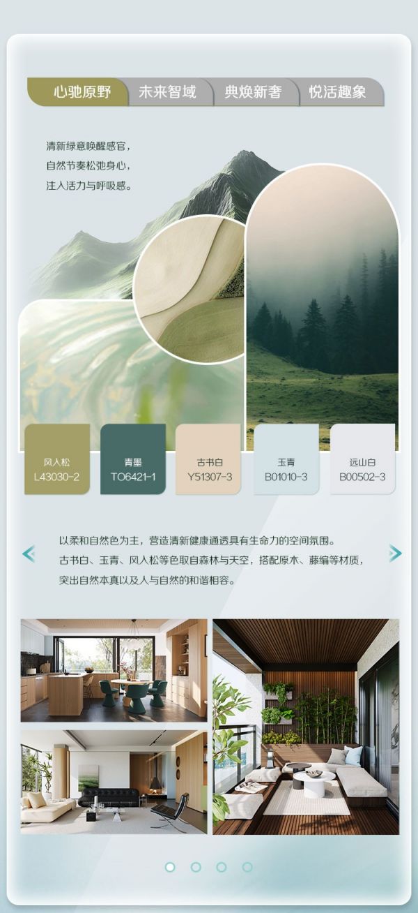 “心驰原野”主题色盘直指当代人对自然疗愈的迫切需求,其色彩以「玉青」为自然基底,搭配风入松、古书白等自然色系。这些色彩灵感不仅源自森林、岩石与天空,更延续了取法自然的调色哲学,将天然石材的呼吸感与传统漆艺的温润质感融入现代涂料。通过三棵树天然植物基漆料的净味技术,让空间在呈现清新通透的自然氛围时,更实现即刷即住的健康守护,特别契合消费者对闲散状态和自我关怀的追求,适用于自然主义、田园风、北欧风及原木风等家居风格。