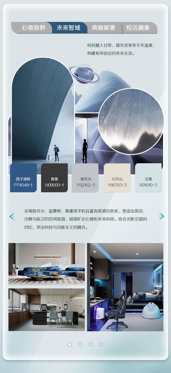 “未来智域”主题色盘聚焦科技与人文的平衡,回应远程办公和智能家居普及下消费者对理性功能与情感温度并存的需求。色彩以「玉青」为沉静基底,搭配银月光、西子湖畔、青黛等平和且富有质感的色调,既保留东方色彩的雅致底蕴,又赋予空间冷静前卫的科技感,适用于意式轻奢、工业风、后现代及包豪斯等风格。