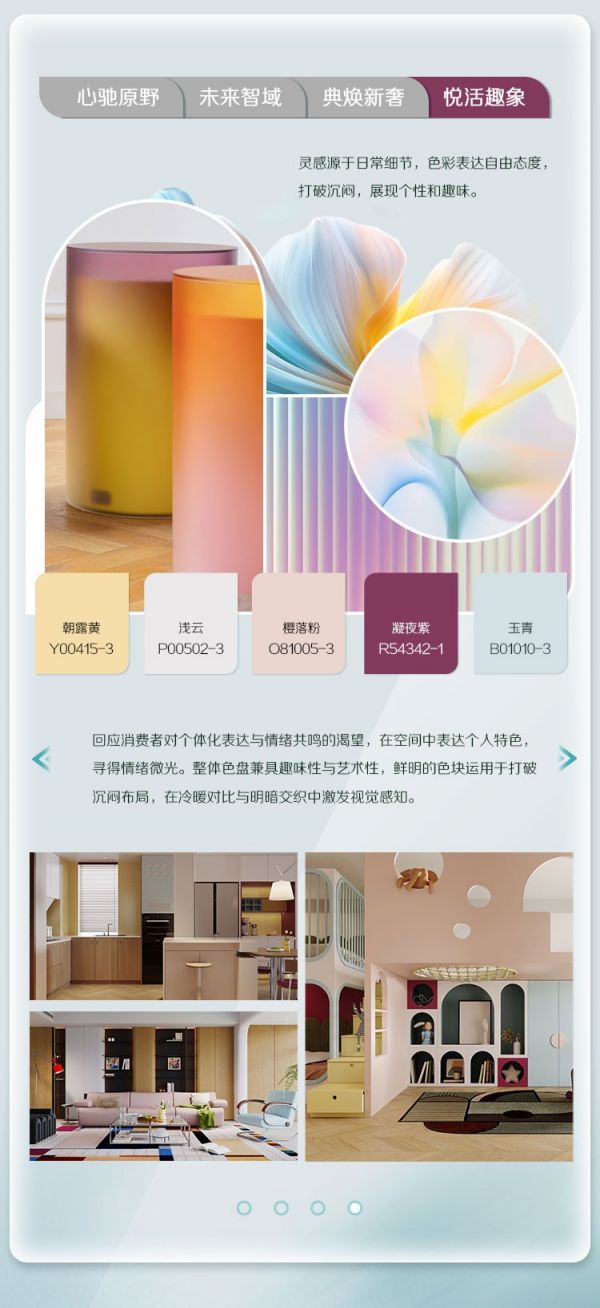 “悦活趣象”主题色盘瞄准Z世代主导的个性表达诉求,强调多元包容的审美转向。色彩以「玉青」瞄准Z世代的个性表达,三棵树以灵活的色彩体系支持多元审美,搭配朝露黄、凝夜紫、樱落粉等活力色调,这些色彩脱胎于三棵树国色体系中国潮年轻化的创新实践。色彩冷暖对比间注入的轻快能量,既满足Z世代对个体化表达的渴望,又依托三棵树“健康+”环保标准,让大胆用色无需妥协健康,适用于奶油风、多巴胺、轻法式及孟菲斯等风格。