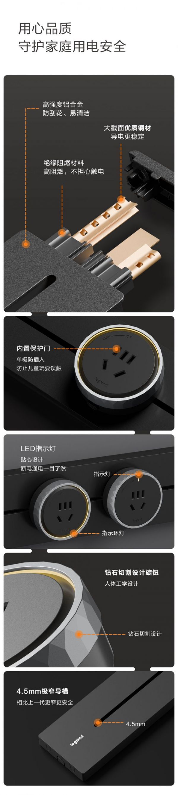 罗格朗轨道插座不仅美观大气,还具备安全性与实用性双重优势。轨道面板采用高强度铝合金,不易变形;搭配绝缘阻燃材料,高阻燃,有效防触电;载流件选用大截面锡磷青铜,导电性能更稳定,插孔内置保护门,避免单极插入、儿童手指误触,为消费者的用电安全提供了保障。同时,该轨道插座拥有8000W超大功率,满足家中多个电器使用。适配器右转通电,左转断电,提供总控开关可一键通断电,LED指示灯清晰显示通断状态,一目了然。