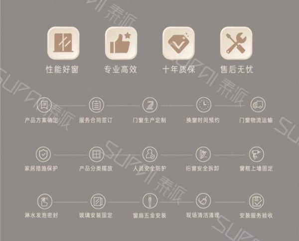 此外,素派门窗五星安装标准,从辅材用料,到安装规范,把握安装精度,优化窗框与洞口间的密封,实现好门窗+好安装+好服务的有效落地。