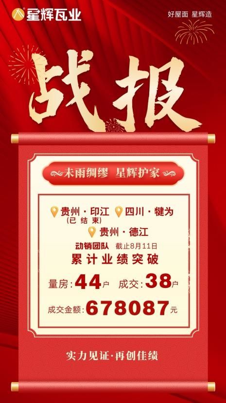 截止8月11日,星辉瓦业贵州印江、贵州德江、四川犍为专卖店在本轮活动期间11天狂揽38单,签单总额突破67万元,再次取得活动的阶段性胜利。这场以“服务力+产品力+品牌力”为内核的终端服务战役,不仅为各地经销商注入增长强心剂,更是将星辉瓦业的“品质”和“口碑”深植多地用户心中。