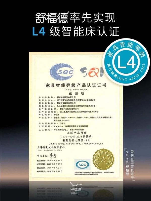 今年,从舒福德主导编写的《智能床国家标准》GB/T45231-2025的重磅发布,到智能床最i高级别L4认证,双重国家级权威认证,一方面对于行业,能够明确标准规范技术路径,倒逼企业从概念炒作转向技术深耕,推动竞争回归价值本质;另一方面对于消费者,“国家标准+等级标识”可以提供清晰选购指南,降低决策成本,避免为冗余功能付费,让购买得更放心。