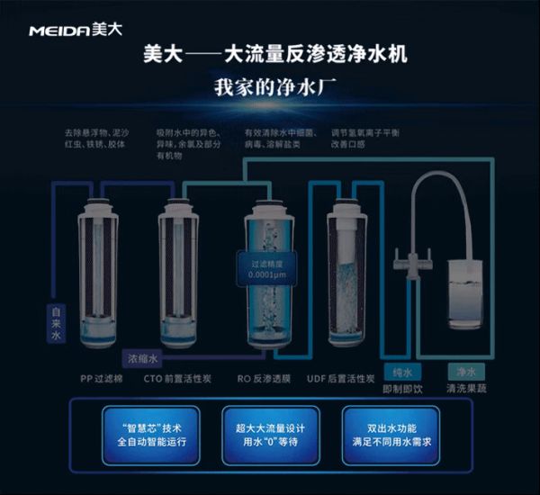 以集成灶为轴心,美大三条生态链向外辐射:集成水槽洗碗机在1㎡的空间内集成了清洗、果蔬净化、切沥、消毒、存储等多功能,一站式优化厨房动线,让备餐更加顺畅高效;全屋净水系统提供从前置过滤到直饮净水的全方位净化方案,从源头杜绝涂层污染,完成水质健康闭环;全屋燃热系统集成恒温燃气热水方案,烹饪洗涤热水即开即享。