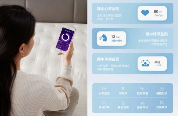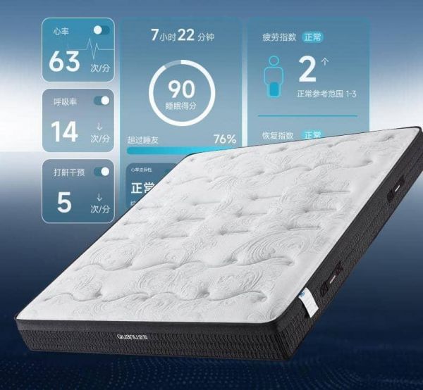 动态健康监测,您的专属睡眠健康管家。心率、呼吸、体动、起夜、睡眠时长……多维度全面健康监测,守护每夜安眠。床垫内置隐藏式压电传感器,无需穿戴设备,即可自动采集睡眠数据,并通过AI智能算法准确识别睡眠阶段,精准感知身体的细微变化。