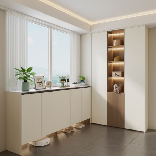 入户区采用高低柜组合设计,功能十分实用。高柜采用一门到顶形式,搭配温润的木纹开放格,营造出简约自然的初印象。矮柜底部巧妙悬空,不仅便于收纳日常穿脱的鞋子,也为扫地机器人提供了专属位置,从而保持空间的整洁干净。