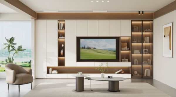 客厅定制整墙电视柜,储物能力极为强大。柜体采用半开放设计,并搭配透明柜门,遵循“藏八露二”的美学原则,使手办、书籍或装饰品都能成为展示的一部分。关上门后,柜面整洁如一,有效防尘且更显高级,瞬间提升客厅的整体颜值。