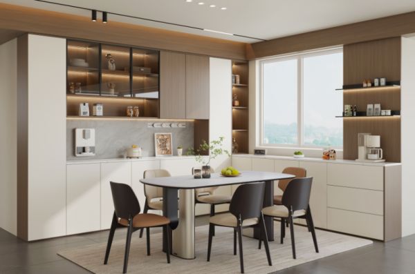 餐厅的转角餐边柜堪称空间利用的典范。高柜区域分层规划:上层作展示区,中层留空作为操作台,下层用于储物。一旁的矮柜则化身为家庭咖啡角,小吧台的氛围感十足。墙面增设搁板打造立体收纳,辅以灵动灯带照明,让这个区域能在早餐台与迷你酒柜之间自由切换。
