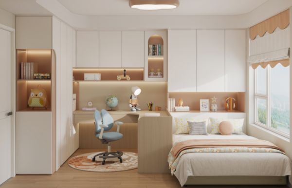 儿童房采用衣柜、书桌与床头柜一体化设计,充分满足孩子成长过程中的睡眠、储物与学习等多重需求。L型书桌自然划分出学习区与休息区,布局实用且能给予孩子满满的安全感。这种成长型的设计理念,使其即使用到成年也依然适用。