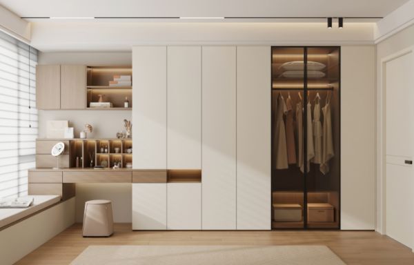 卧室将飘窗、梳妆台与衣柜进行一体化定制,极大提升了空间整体性。衣柜巧妙穿插定制台面、抽屉与分类收纳格,让护肤品和化妆品可以分区收纳,使用动线超顺手。飘窗铺上软垫,即刻变身一个舒适的休闲角落,成功整合了衣物收纳、梳妆打扮与休息小憩三大功能。