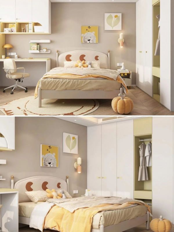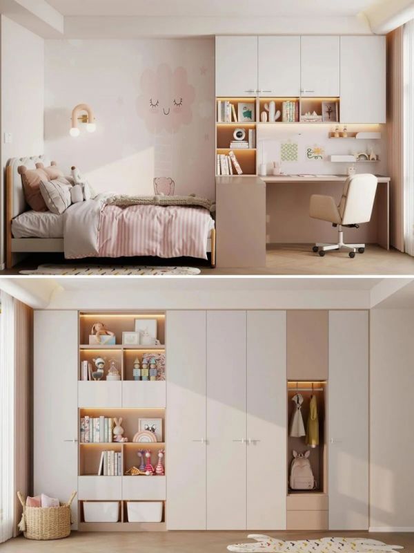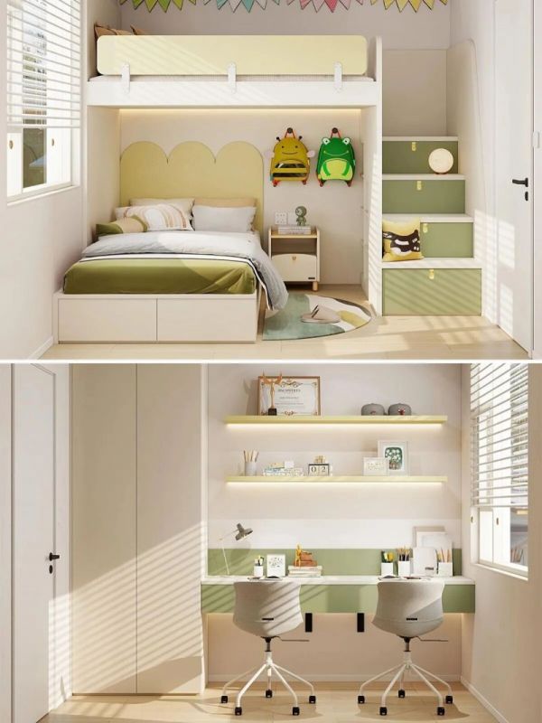 床底可加装大容量抽屉,搭配收纳箱分类存放物品;门后挂式收纳袋,培养孩子自主整理习惯。
