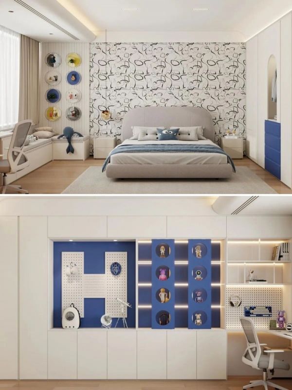 选择可调节高度的书桌、层板可移动的衣柜,墙面用磁吸板替代固定装饰,方便随年龄调整空间功能。