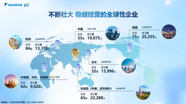 大金通过不断调整业务战略,并购扩充版图,最终发展成规模庞大的全球性企业。直至目前,大金的业务已遍布全球175个国家和地区,拥有130家生产基地、351家分公司,全球10万余名员工,通过立足本地的经营,持续为全球市场提供因地制宜的产品和服务,也充分证明了大金在全球化方面的卓越成就。