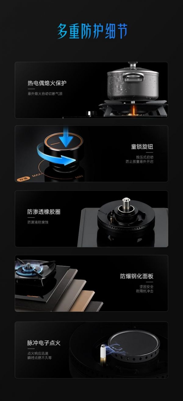 在产品安全层面,Haotaitai妈妈安全灶配备了热电偶熄火保护功能,可在意外熄火时自动切断气源;童锁旋钮设计防止孩童误触;防爆钢化面板能抵御高温和冲击。这些设计从硬件层面确保了灶具的安全性。