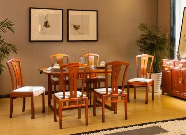 线条凝练;以红木之温润搭配素净坐垫,勾勒出古雅又舒适的用餐天地,每一道纹理都蕴藏东方木作的匠心,令用餐时刻也浸满中式生活的雅致情韵。