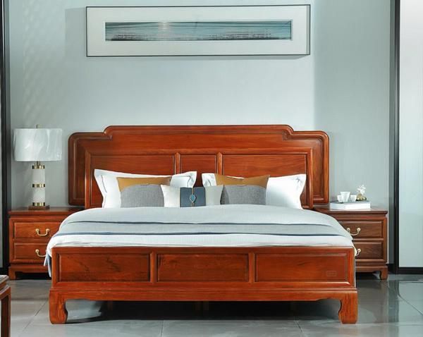 甄选优质大果紫檀打造,木质温润。床头造型大气典雅,既保留中式家具的端庄韵味,又以简洁轮廓契合现代审美;床体结构稳固、做工精细,红木自带天然果香,为空间营造出舒适的休憩核心