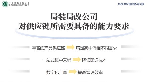 贾锋提出,家装企业需拓宽供应链体系,以此满足消费者多样化的局改需求;通过集中仓储管理与多品类统筹配送的模式,有效降低物流与仓储成本;重点培养具备多工种作业能力的安装与维修队伍,从而提升服务协同效率与最终交付质量。他特别强调,尽管当前供应链仍面临产品分散、单笔服务规模小等痛点,但家装企业必须将提升协同效率作为核心突破方向。