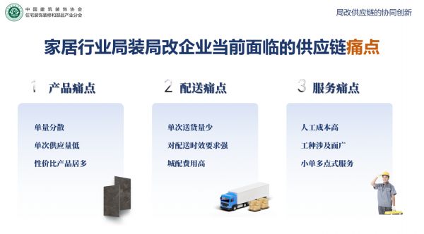 华耐家居董事长贾锋指出,在当前存量房主导的市场环境中,局改赛道拥有一定的发展潜力,然而该赛道目前正面临“尚未找到经济规模” 的困境。在供应链层面,具体痛点主要分布在产品、配送与服务三大环节。在产品端,局改需求呈现出明显的碎片化特征,导致企业难以形成批量生产与采购的优势;在配送端,局改业务对送货时效要求极高,单次送货量往往较少;在服务端,不仅人工成本高昂,涉及的工种范围还十分广泛,进而导致服务效率与响应速度无法满足市场需求。