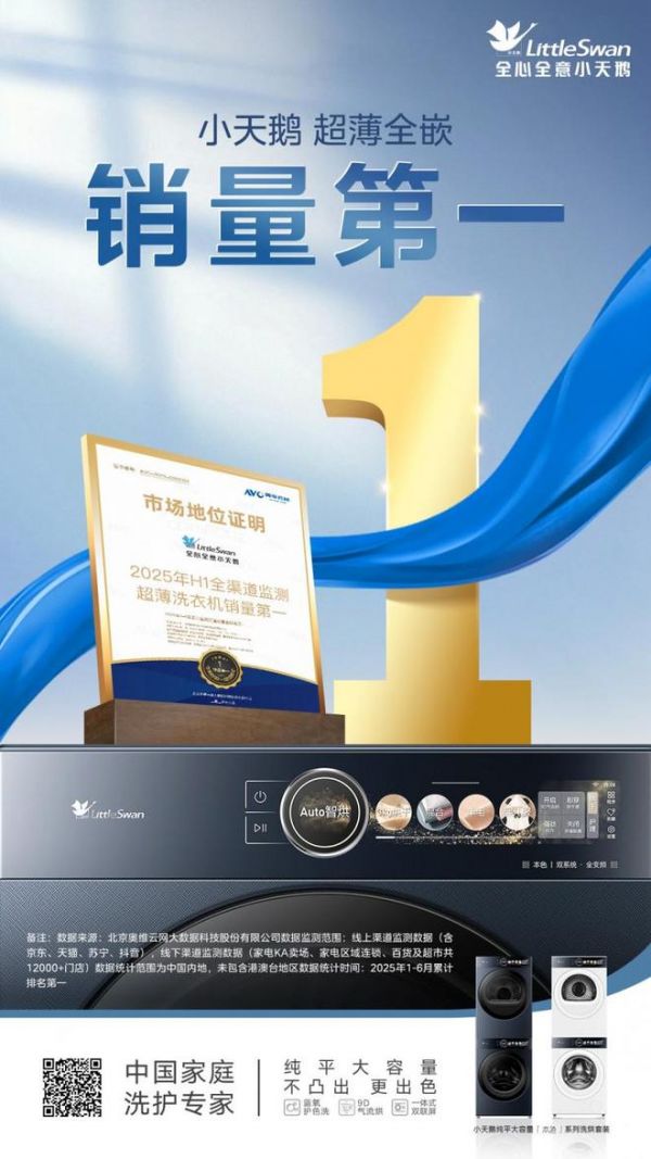 为精准解决这一痛点,小天鹅率先推出全球首个灵活可堆叠分区洗烘一体解决方案 —— 迷你小乌梅系列,不仅完美满足了消费者对分区健康洗护与干衣的双重诉求,更在8月27日奥维云网数字生态大会上一举斩获 “悦享健康云鼎奖”。与此同时,其纯平全嵌系列产品凭借亮眼的市场表现,同步摘得 “2025年 H1全渠道检测超薄洗衣机销量第一” 桂冠,双奖加冕的背后,是小天鹅对用户需求的深度洞察与技术实力的硬核支撑。