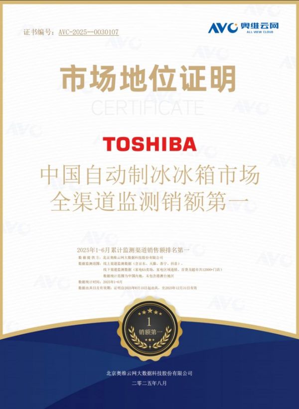 自动制冰已从高端冰箱的 “选配项” 升级为 “刚需功能”,而东芝的市场表现正印证了这一趋势。根据北京奥维云网大数据科技股份有限公司于2025年8月15日出具的《市场地位证明》,东芝在2025年1-6月中国自动制冰冰箱市场全渠道监测中销售额排名第一。监测范围覆盖线上主流电商平台(包括京东、天猫、苏宁、抖音)及线下12000余家门店,数据来源全面、权威性强,真实反映了东芝在自动制冰这一高端功能赛道中的领军地位。