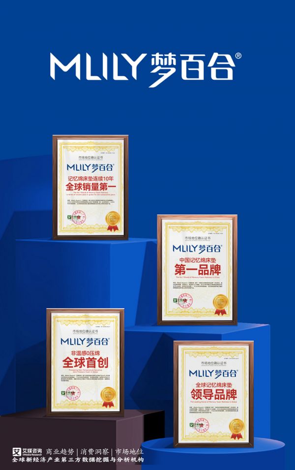 基于艾媒自主研发并获得省部级重大科技专项立项的CMDAS大数据系统监测及严格的调查,以及对中国(不含港澳台)记忆绵床垫、非温感0压绵等市场研究比对的结果进行统计确认,梦百合荣获全球领先的新经济产业第三方数据挖掘和分析机构iiMedia Research(艾媒咨询)授予的“记忆绵床垫连续10年全球销量第一”“全球记忆绵床垫领导品牌”“中国记忆绵床垫第一品牌”“非温感0压绵全球首创”市场地位确认。