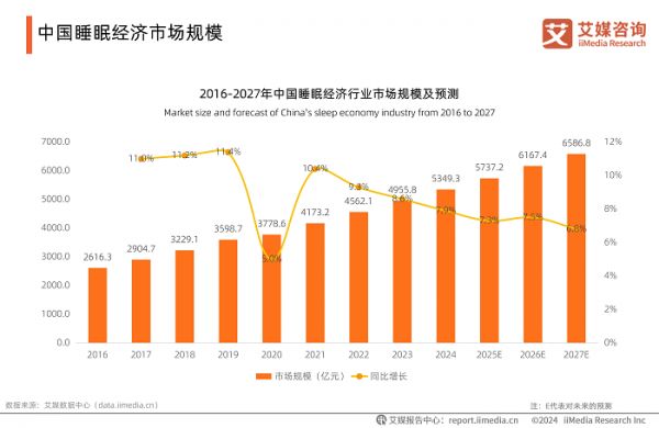 近年来,中国睡眠经济正以迅猛态势发展,而背后是国民普遍的睡眠需求驱动。iiMedia Research(艾媒咨询)数据显示,超九成国民经常或偶尔会出现睡眠质量问题,睡眠浅、入睡困难、易醒等问题成为困扰国民的主要难题。在需求驱动下,中国睡眠经济市场规模从2016年的2616.3亿元增长至2024年的5349.3亿元。随着睡眠产品市场渗透率不断提高,产品类型不断增多,预计2027年中国睡眠经济市场规模将达6586.8亿元,庞大的市场需求为睡眠相关企业带来了广阔的发展空间。