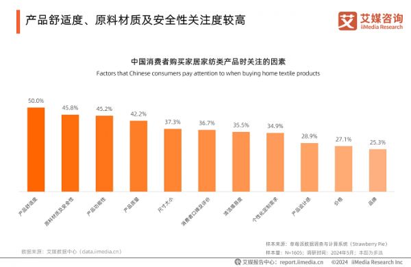 在睡眠产品消费偏好上,消费者对睡眠产品的选择更趋品质化。iiMedia Research(艾媒咨询)数据显示,56.8%的人倾向通过家居家纺类产品改善睡眠,其中床垫(54.8%)、睡觉抱枕(50.0%)是热门选择;购买时,五成消费者优先关注舒适度,原料安全性、产品功能性等也成为核心考量,这反映出市场对高品质睡眠产品的需求升级。