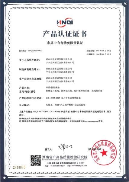 自1985年成立起,星港家居便将绿色健康睡眠视为品质红线。面对就更严格的新国家标准,星港床垫以远优于国标的检测结果,刚荣获湖南省首张《家具中有害物质限量认证证书》。40年来,星港从单一床垫产品扩展至软床、沙发等全品类家具,其对于品质的严苛标准也不断升级。此次新国标的实施,不只是床垫产品,星港的软床和沙发产品也积极接受检测,率先将全系列产品纳入新标准检测体系之中,确保产品质量持续符合新标准要求。
