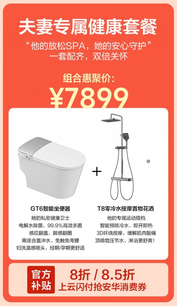 该套餐包含GT6智能马桶与T8零冷水按摩花洒,兼顾女性健康防护与男性舒适放松,主打健康除菌与舒适沐浴体验,贴心守护每一刻。
