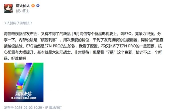 综合来看,即将发布的海信E7Q可以说精准把握住了大众用户对高端体验的追求,把消费者所期待的做到了极致——它不是盲目堆参数,而是针对用户最容易踩的坑,用实打实的技术解决问题。再加上海信“全球份额前二、Mini LED双冠王”的实力背书,产品品质有保障。如果你最近在纠结“买哪款Mini LED电视不踩坑”,不妨再等等9月下旬的海信E7Q——毕竟,能同时满足“画质顶、抗光强、价格良心”的机型,真的不多见。
