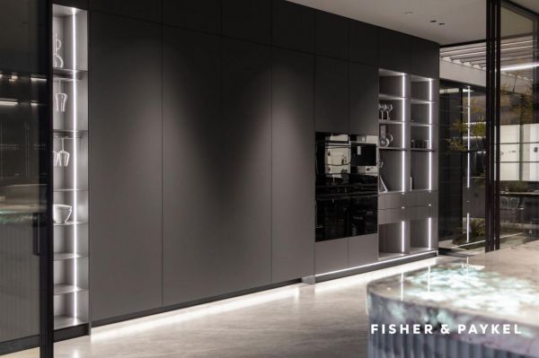 在AI智慧体验基础上,三翼鸟与博洛尼还联手打造了满足不同人群的高端定制方案。一方面,博洛尼是行业领先全屋定制品牌,带来从橱柜定制、空间设计到家居软装的全面覆盖。另一方面,三翼鸟则整合卡萨帝、FPA高端家电及套系产品,实现高端家电与高定设计的深度融合。例如店内一层所展示的“奢适自然”空间,整个厨房采用全套斐雪派克电器,打开柜体其实是嵌入式冷藏冰箱,面板自由定制,可以完美融入各种家装风格。
