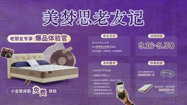 作为系列活动的首发环节,「美梦思老友记」爆品体验官招募已于即日启动,从即日起至9月30日,用户带指定话题在小红书平台发布发布与美梦思集团(含旗下品牌:MEMO’S美梦思、Cozleep斯寐)相关原创笔记,即可联系官方客服登记领取品牌周边礼品,更有机会获赠美梦思年度爆款产品,成为5名"小金垫床垫终身体验官"之一。